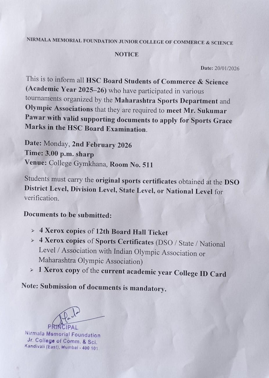 - NOTICE FOR GRACE MARKS FOR SPORTS STUDENTS IN HSC BOARD EXAM FEB - 2026