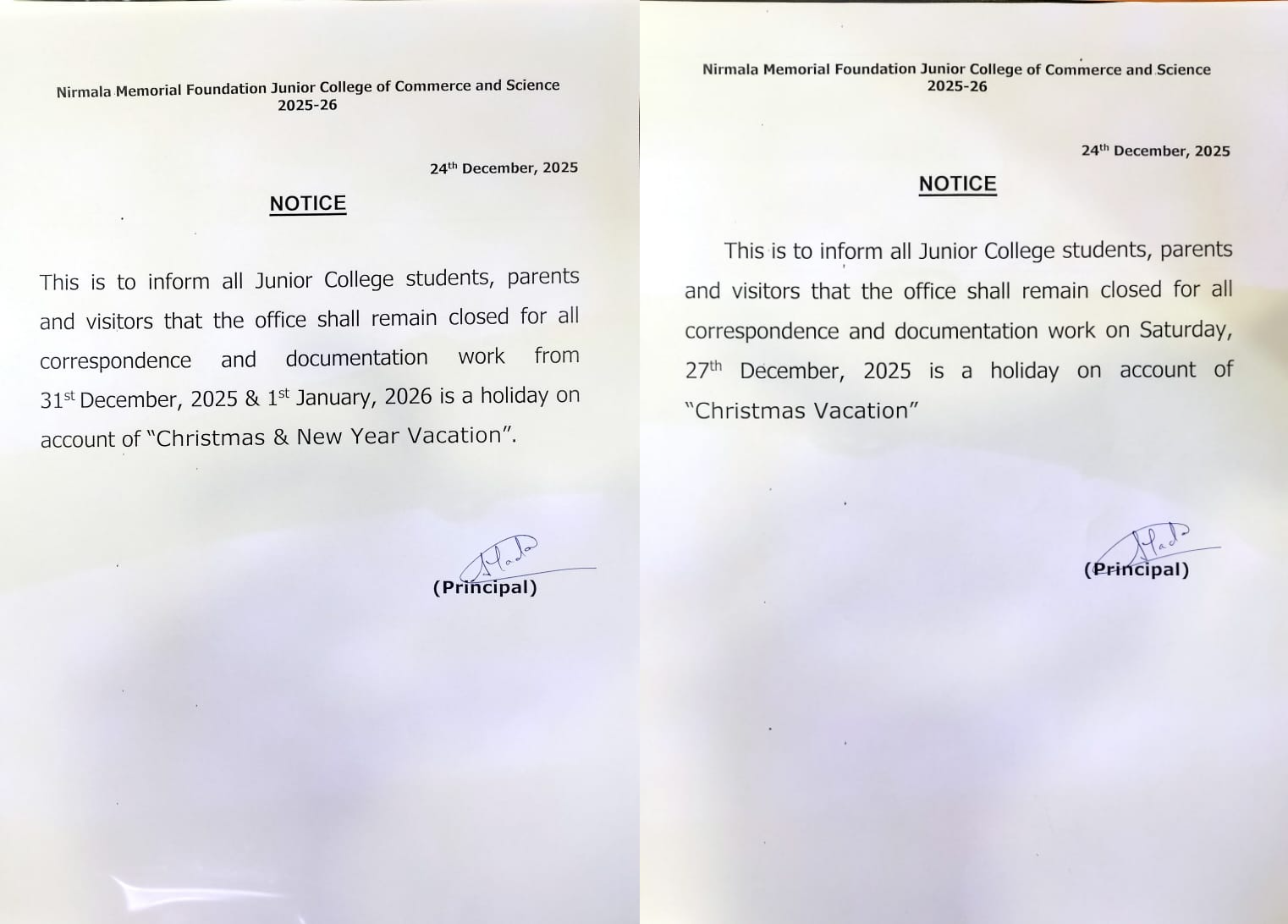 - Notice regarding - Christmas Vacation 2025-26
